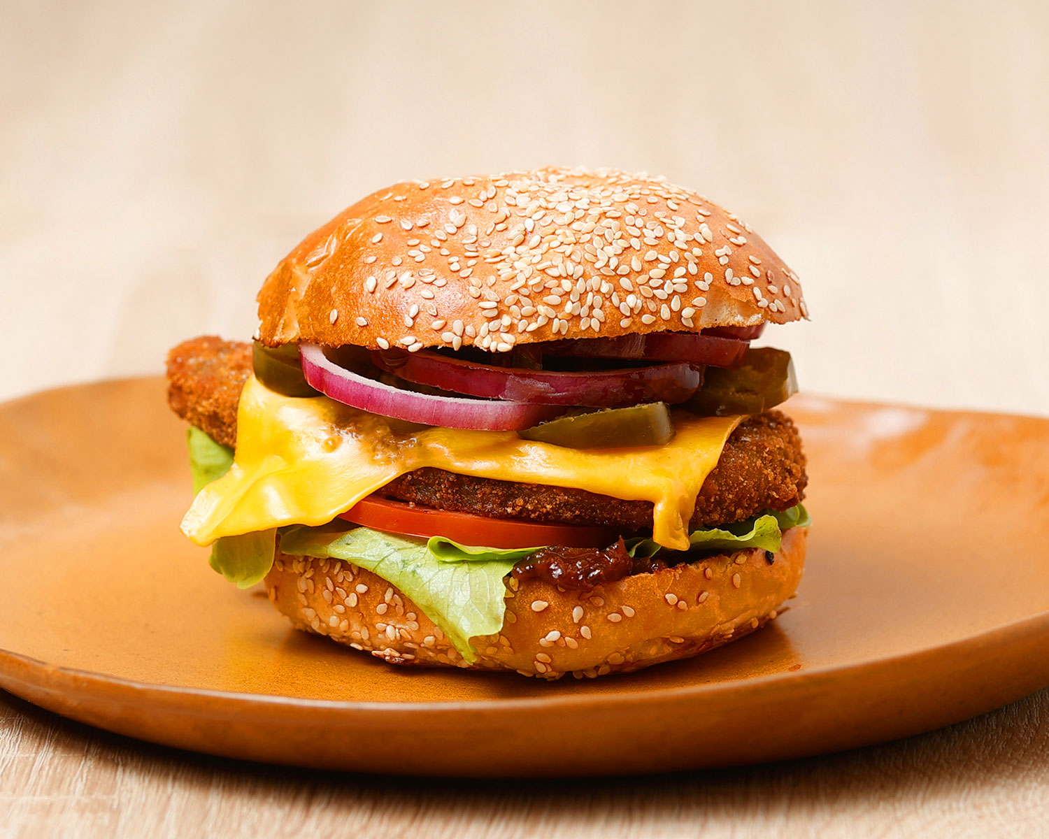 Ingredients: Crumbled vegetable patty, fried jalapeños, relish, smoky BBQ sauce, cheddar cheese, tomato, lettuce, onion.