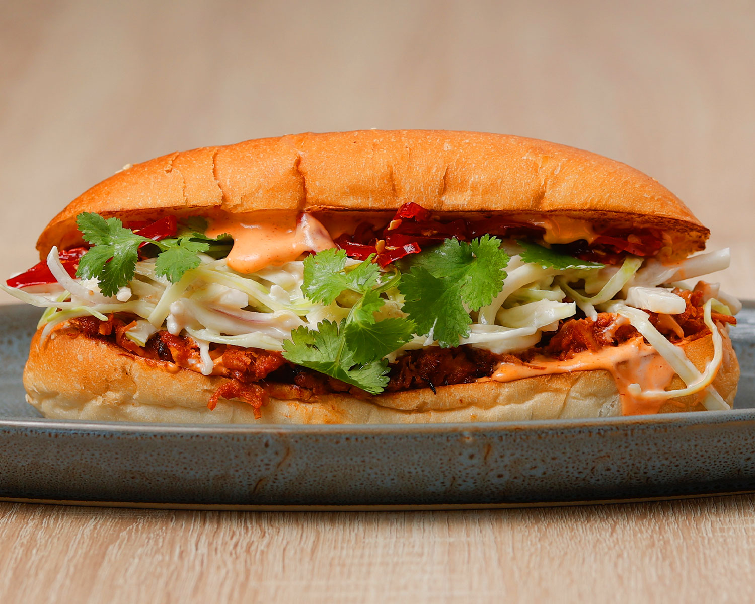 Ingredients: Marinated pulled pork, radish, apple, onion, coriander, chilli jam, bulgogi mayo, toasted black sesame seed burger bun